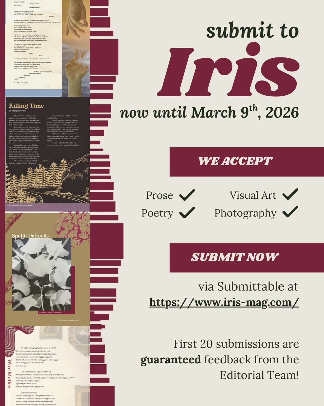 At Iris Literature and Arts Magazine, we celebrate creative endeavors of all kinds. We strive to publish the best student work on campus.